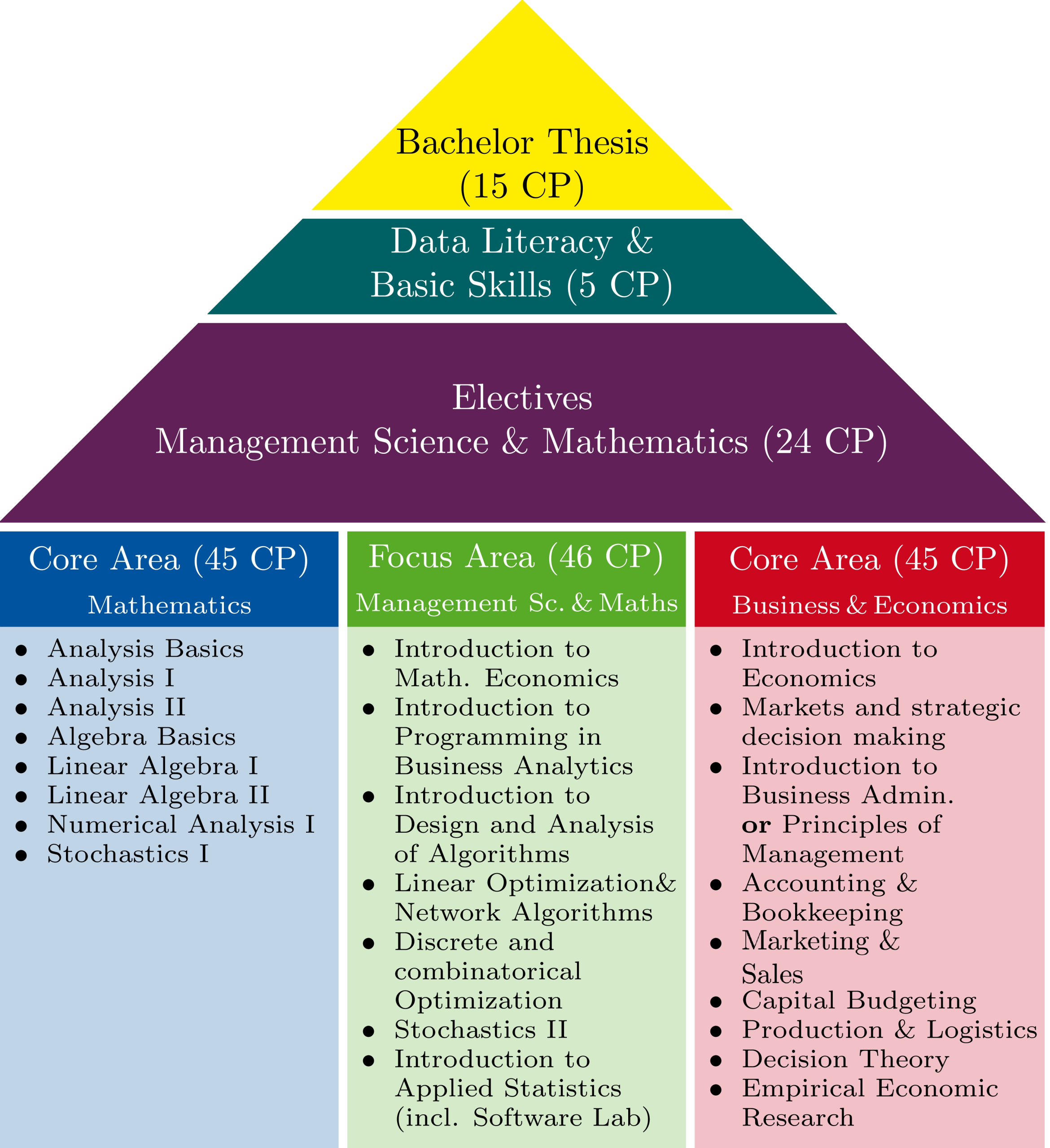 The compulsory area of the Bachelor’s degree program in Management Science and Mathematics consists of three pillars: Mathematics, Economics and Management Science. In the basic area of mathematics, you will learn basic mathematical structures and techniques. In the basic area of economics, we discuss fundamental business and economic issues and models.